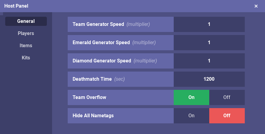 The creator, or host, and co-hosts of a Custom Match, can access the Host Panel. The Host Panel allows players to do, but is not limited to: changing team generator speeds, disabling and enabling certain kits, blacklisting certain items, setting co-hosts, kicking players, disabling bed breaking, and restricting block breaking. The update of July 15, 2022, added map saving and the option to enable placing blocks in restricted areas.